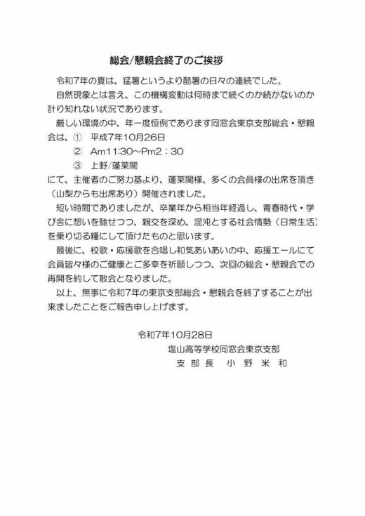 拝啓 錦秋の候同窓生の皆様におかれましてはお変わりなくご活躍のことと存じます。好天に恵まれました同窓会東京支部総会にはご多用のところご出席を賜り誠にありがとうございました。同窓会創立60周年記念に母校吹奏楽部ならではの大音量輝がしさを存分に発揮時間が止まるような一時みんなで歌うことで塩高(心)が一つになりお陰様で最良の絆と繋がりと友情の輪を拡げる宴になりました。来る年も再会できますことを楽しみに致しております。取り急ぎ書面にて御礼方々ご挨拶申し上げます。 平成三十年十月吉日 塩山高等学校同窓会東京支部 支部長 三枝良一 |